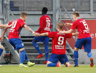 Uerdinger Jubel nach dem 0:1 durch Maximilian Beister (Mitte) in der 75. Spielminute.