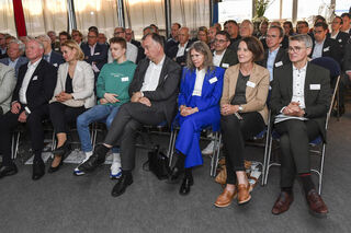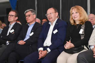 Im Publikum sitzen Florian Kranefuß (v.l.n.r.) sowie der Vorstandsvorsitzende der MVV, Gabriël Clemens, Mannheims OB Christian Specht und seine Lebensgefährtin Bettina Schenk.