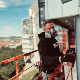 Graffiti-Künstler Daniel Ferino bei der Arbeit an der Außenfassade des Fritz-Walter-Stadions auf dem Betzenberg in Kaiserslautern.
