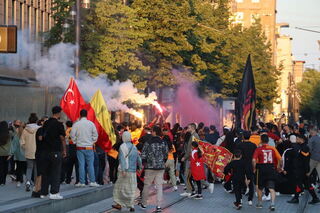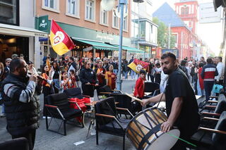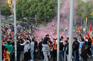 Bis in die Nacht hinein setzen sich die Feierlichkeiten der türkischen Fußball-Fans am Wasserturm fort.