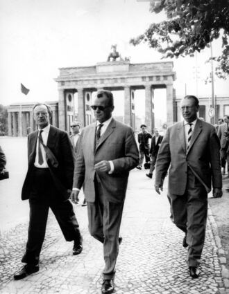 "Wir werden uns niemals mit der brutalen Teilung dieser Stadt, mit der widernatürlichen Spaltung unseres Lebens abfinden." Willy Brandt, 1961. Bild: Der Regierende Bürgermeister von Berlin, Willy Brandt (M), am 13.08.1961 am Brandenburger Tor, rechts der Pastor und SPD-Politiker Heinrich Albertz.