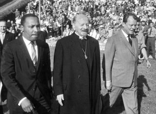 "Auf beiden Seiten der Mauer sind Gottes Kinder, und keine von Menschenhand geschaffene Barriere kann diese Tatsache auslöschen." Martin Luther King, 1964. Das Foto zeigt den amerikanischen Bürgerrechtler und Baptistenpfarrer (l) mit Bischof Otto Dibelius und Willy Brandt, 1964 in Berlin aufgenommen.