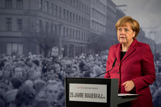 "Wir können die Dinge zum Guten wenden - das ist die Botschaft des Mauerfalls." Angela Merkel, 2014. Das Foto wurde bei einer Gedenkveranstaltung 2014 an der Bernauer Straße in Berlin aufgenommen. Im Hintergrund ist ein Bild zu sehen, das die Grenzöffnung im Jahr 1989 zeigt.