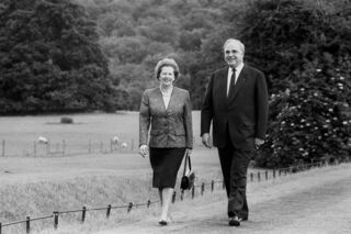 "Die Mauer ist ein stetes Mahnmal dafür, dass jene, die die Freiheit unserer östlichen Nachbarn unterdrücken, gleichzeitig darauf aus sind, unsere eigenen Freiheiten auszulöschen." Margaret Thatcher, 1982. Das Bild, 1988 in Großbritannien aufgenommen, zeigt die ehemalige britische Premierministerin mit Helmut Kohl.