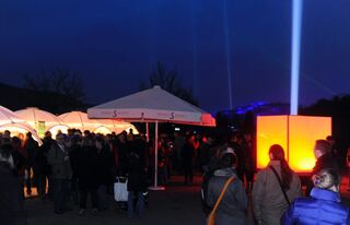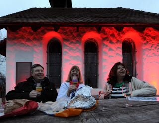 Die Michaelskapelle auf dem Dürkheimer Michelsberg ist in rotes Licht getaucht - diese Besucher der Weinbergnacht 2013 genießen ein Picknick in schöner Atmosphäre.