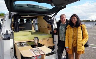 e4Testival E-Auto-Festival Hockenheimring..Holger und Annette Wunsch mit ihrem selbst umgebauten ID-Buzz, mit dem sie gerade auf einer 6500 Kilometer langen Urlaubsreise waren. ...Bild: bjz.18.10.2025