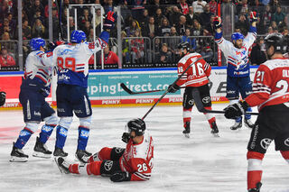 Jubel zum 0:1 - Torschütze Matthias Plachta hat in den ersten Minuten ein Tor für die Adler geschossen.