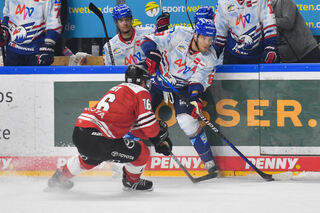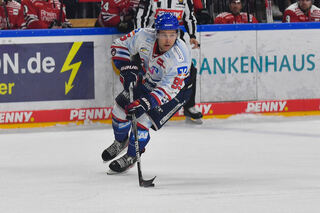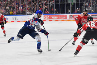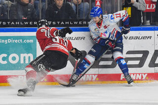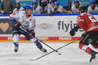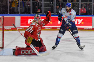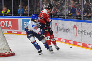 Kopf-an-Kopf-Rennen zwischen Tim Wohlgemuth (Adler Mannheim) und Loouis Marc Aubry (Kölner Haie).