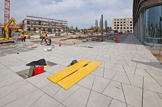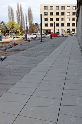 Der Chisinauer Platz ist die zentrale Stelle im Quartier. Im Moment werden die Pflaster verlegt, hier sieht man die drei Farbabstufungen. Bald sollen hier 50 Bäume emporwachsen.