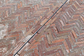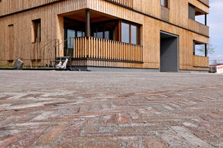 Ein besonderes Pflaster aus Ziegelsteinen kennzeichnet spezielle Bereiche, zum Beispiel die Plätze vor den Gastronomiebetrieben oder der Zugang zum autofreien Innenhof.