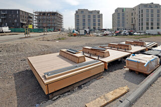 Das Gelände aus Richtung Hedwig-Eppstein-Straße gesehen. Im Vordergrund warten die Sitzgelegenheiten auf ihre Platzierung auf dem Chisinauer Platz.
