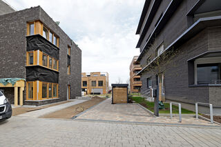 arkhaus und angrenzendes Wohngebäude der Deutsche Wohnwerte GmbH & Co. KG. Diese Schräge ist keine Auffahrt, sondern die Basis für eine Treppe die auf höher gelegene Gemeinschaftsflächen führt.