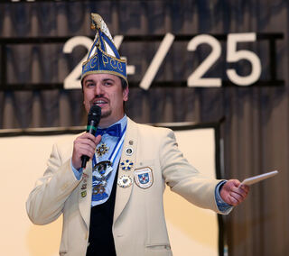 Dennis Winterkorn begrüßt die Gäste in der Mehrzweckhalle. Bild: Lenhardt