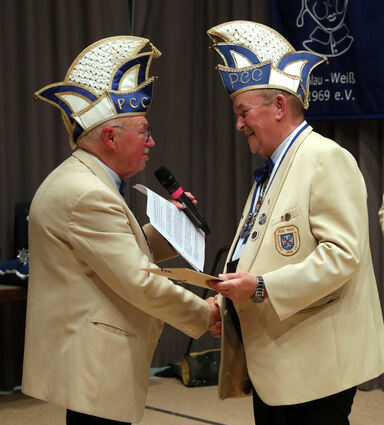 Wolfgang Eichhorn (li.) verleiht die Urkunde zum Ehrenelferrat an Klaus Choschzig. Bild: Lenhardt