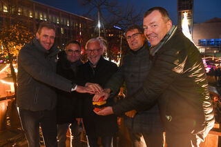 Lutz Pauels, erster Vorsitzender der Werbegemeinschaft Mannheim City, und Wirtschaftsbürgermeister Michael Grötsch haben die Weihnachtsmärkte offiziell eröffnet. Hier zusammen mit Sebastian Ackermann, Dekan Karl Jung und Stefan Hock.