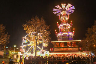 Die Weihnachtspyramide mit Café im ersten Stock und ein Riesenrad leuchten auf dem Weihnachtsmarkt am Wasserturm...
