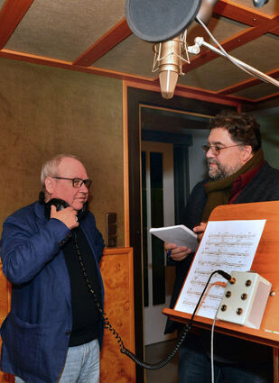 Hier zeigt Heck Kulturredakteur Klotz die Gesangskabine, in der zurzeit Wagner-Startenor Klaus-Florian Vogt in seinen seltenen Auszeiten von den großen Opernbühnen dieser Welt in Grasellenbach im Stil von Peter Hofmann orchestrierte Rocksongs aufnimmt.