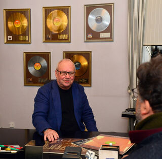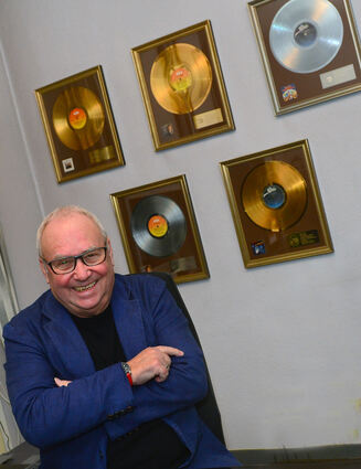 Hier posiert Heck mit einigen seiner zahlreichen Goldenen und Platin-Schallplatten. Das Haus, in dem sich sein Studio befindet, atmet fast wie ein Museum Musikgeschichte.