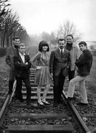 Auf den Gleisen zum Erfolg: Joy & The Hit Kids im 1967 bei ersten Promotionaufnahmen (v.l.) Dieter Kindl (Gitarre Bass), Roland Heck (Keyboards), Joy Fleming (Gesang), Klaus R. Nagel (Gesang), Albin Metz (Bass, Trompete, Posaune) und Hans W. Herkenne (Schlagzeug). Bild: Archiv Klaus R. Nagel