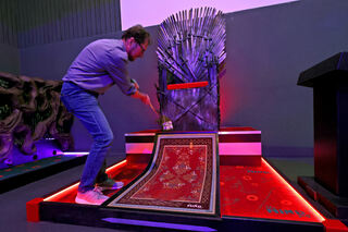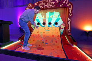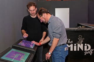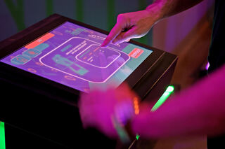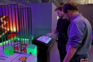 An einem Touchscreen-Portal ist dann der Name aller Spieler einzugeben, bis zu sechs sind pro Gruppe erlaubt. Hylla zeigt "MM"-Reporter Steffen Mack, wie es funktioniert. Bild: Christoph Blüthner
