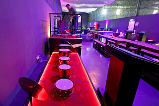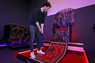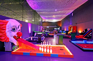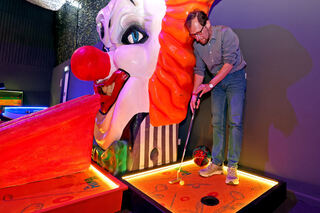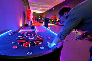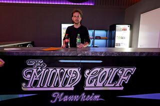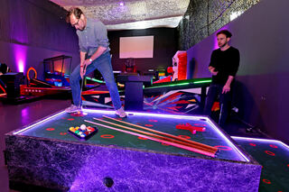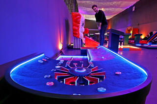 Blick in Deutschlands erste Mindgolf-Anlage. Sie ist in einem Nebenraum des Fußballcenters zwischen Carl-Benz-Stadion und Luisenpark errichtet worden. Bild: Christoph Blüthner