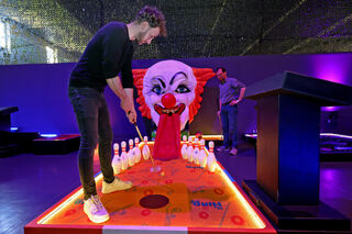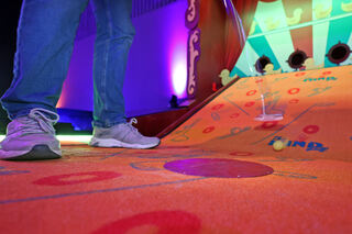 An jeder Bahn steht ein Monitor zum Einchecken sowie am Ende zur Eingabe der Schlagzahl. Zettel auf einem Klemmbrett, wie beim Minigolf üblich, braucht man hier nicht. Bild: Christoph Blüthner