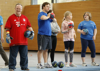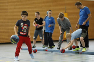 Beim Spiel "Basketball" muss ein in der Mitte liegender Basketball mit den Handbällen getroffen werden, damit er zur gegnerischen Seite rollt.