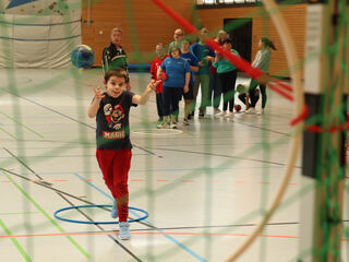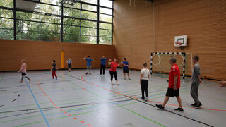 Bei dieser Übung müssen die Teilnehmer aus bestimmten Positionen durch zwei Ringe im Tor werfen.
