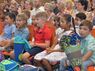 Schillerschule: Die 2b begrüßte die Schulanfänger mit einem Lied. Links sitzt die 3b, die als Paten fungiert. Hinten steht Schulleiter Torsten Wiechmann.