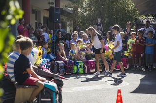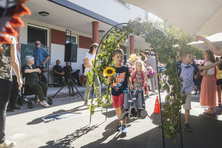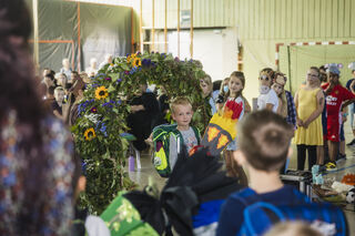Tim läuft durch den Blumenbogen zu seiner Klasse.