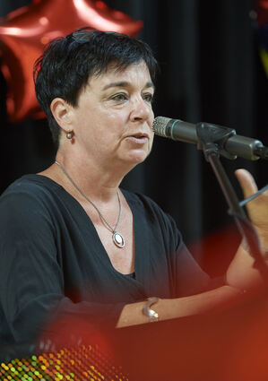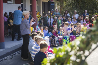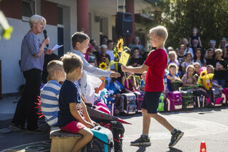 Steinerwaldschule in Nordheim: AntjeKühlberg begrüßt die Erstklässler.