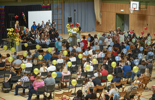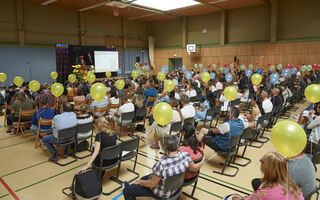 Die vier Realschulklassen werden gemeinsam begrüßt - jede Klasse mit andersfarbigen Ballons.