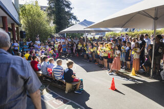 Steinerwaldschule Nordheim: die Patinnen und Paten aus der vierten Klasse halten ihre Blumen bereit.