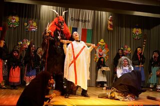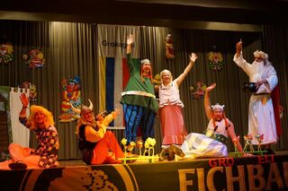 Die Karlstern Hexen: Zunftmeister Tobias Schüpferling malträtiert Sitzungspräsident Alois Baumann und Vizepräsident Salvatore Cacciatore mit einer hochnotpeinlichen Befragung unter den Augen von Luzifer Markus Schüpferling (vorne v.li.n.re.).