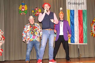 Aulaner-Präsident Herbert Miehm und Alois Baumann (re.) tanzen auf der Bühne zu den Stimmungsliedern von Sänger Michael Kossmann (Mitte).