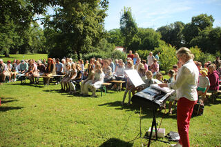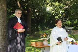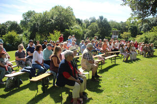 Beginn und Höhepunkt des zweiten Festtages zugleich bildet der traditionelle Ökumenische Gottesdienst auf der Badewiese, zu dem sich bei strahlendem Sonnenschein zahlreiche Rheinauerinnen und Rheinauer einfinden.