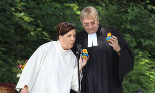 Dass es bei diesem Gottesdienst dem Anlass entsprechend etwas lockerer zugeht, demonstrieren die beiden Geistlichen mit ihren Quietsch-Enten.