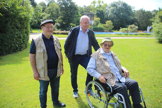 Besonders gern gesehener Gast an jenem Vormittag ist der Mitbegründer des Fördervereins Parkschwimmbad von 2002, der 85-jährige Leander Bausch, hier rechts mit Sohn Thomas und dem früheren Fördervereins-Vorsitzenden Klaus Schäfer (l.).