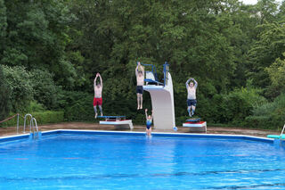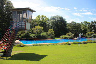 Zweiter Tag des Schwimmbadfestes im Parkschwimmnbad Rheinau: Im Gegensatz zum ersten Festtag herrscht prachtvoller Sonnenschein, am Morgen wartet das malerische Parkschwimmbad auf seine Besucher.