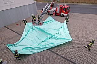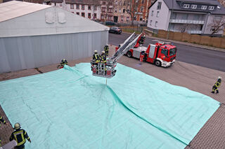 Von oben wird das Notdach auf das Gebäude abgelassen, die Feuerwehrleute auf dem Boden ziehen die Plane in die richtige Position.