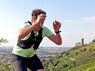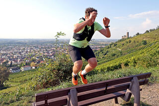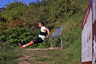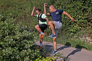 Auch Sprünge an einem Mäuerchen sind Teil der Übung. Mit auf dem Foto: Oliver Radig vom Fitness-Unternehmen Pfitzenmeier.