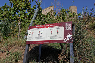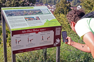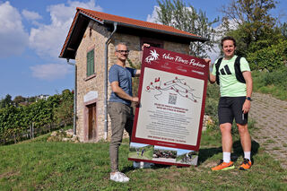 Dieses Schild weist auf den neuen Fitnesspfad hin. Im Bild: Manuel Bretschi (Winzergenossenschaft Schriesheim, links) und "MM"-Redakteur Torsten Gertkemper-Besse.
