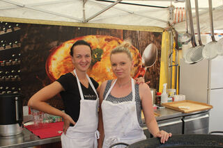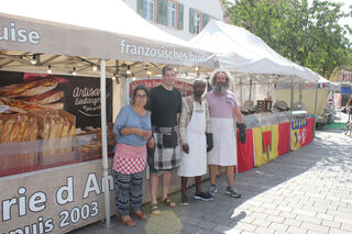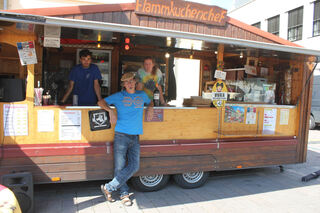 Flammkuchenchef Jonathan Schuler (vorne) ist jedes Jahr mit seinem Wagen dabei und wird unterstützt von Batist (l.) und Isabelle.