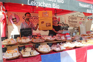 Jean-Loup (l.) und Corinne Gilard bieten Nougat mit Orange, Karamell oder Himbeere an. Kekse aus der Bretagne, Cidre aus der Normandie und Crêpe locken die Besucher an den Stand.