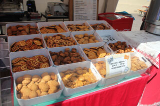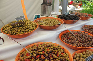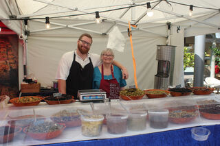 Roman (l.) und Claude Schneider aus Wissembourg verkaufen Oliven, Marmelade und selbst gemachte Kekse.
