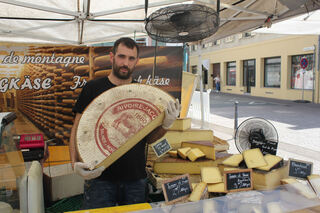 Kevin Bergeas mit einem 27 Kilogramm schweren Laib Käse aus den Alpen.