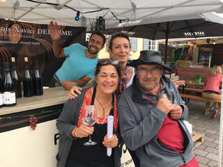 Beim Weinstand von François Delorme (hinten) genießen auch die Kollegen ein Glas Wein. Béatrice Delorme (v. l.), Agnes Badey und Franck Perrin.