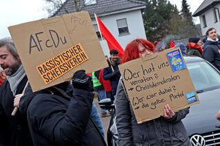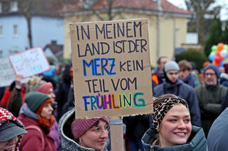 Protest vor der Kulturhalle Feudenheim. Rund 400 Demonstrierende hatten sich beim Wahlkampf-Auftritt von Friedrich Merz (CDU) eingefunden.