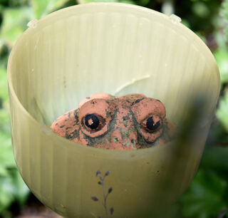 Ein kleiner Frosch lugt aus einer alten Lampe hervor.