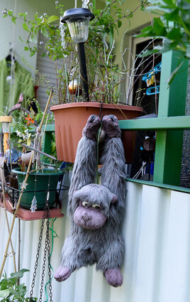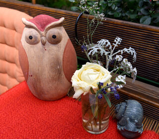 Die selbst bemalte Eule des Nachbarn bekommt einen Ehrenplatz zwischen den Stühlen.